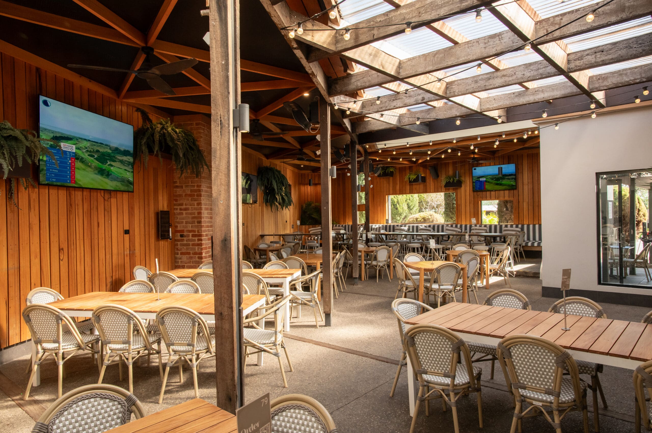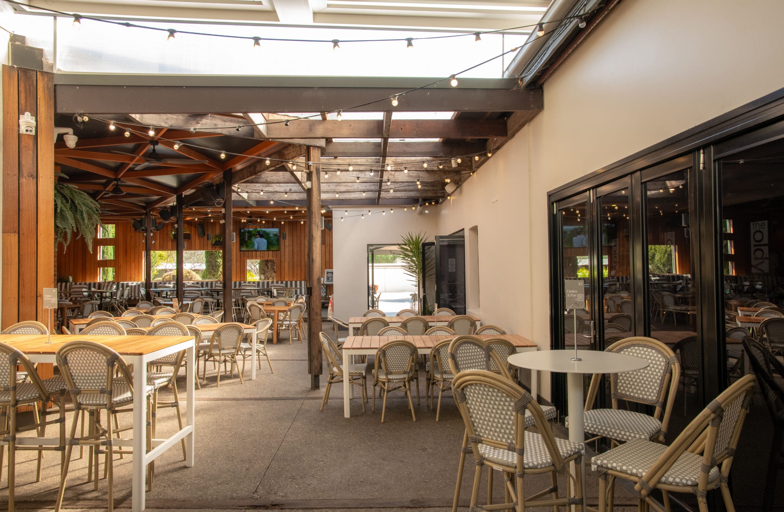 Similar to the corner garden, the half garden at The Old Noarlunga Hotel offers a relaxed outdoor setting, with flexible seating and a welcoming atmosphere. This area includes heating, fans and a TV for year-round comfort.